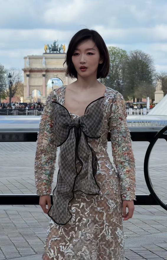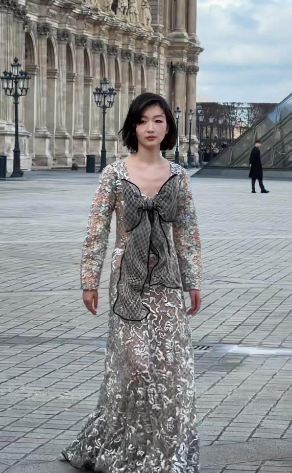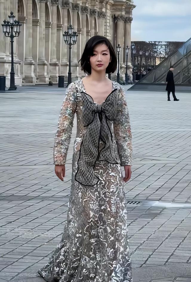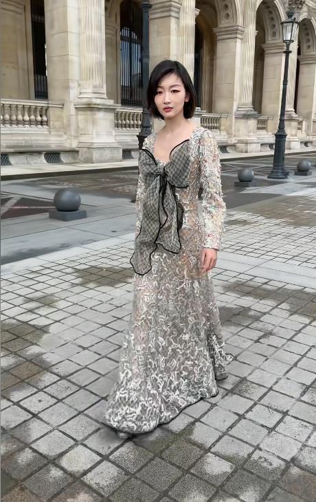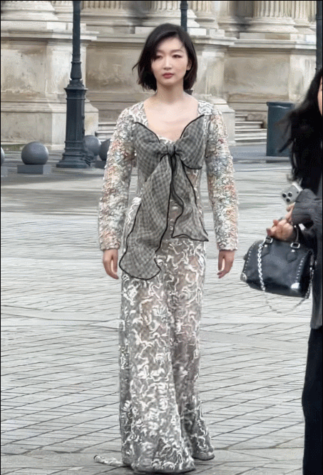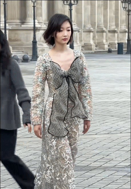 在LV大秀现场,周冬雨身穿品牌2026春夏系列的银白提花蕾丝透视长裙。这条裙子的“杀手锏”在于全身覆盖的亮片,与秀场灯光交织,随着她的步伐产生微光流转的视觉效果,被时尚媒体精准捕捉为“行走的流动星河”。而她标志性的短发造型,一如既往地强化了那种清冽又灵动的气质,被评价为完美演绎了“甜酷兼具的先锋美学”。
