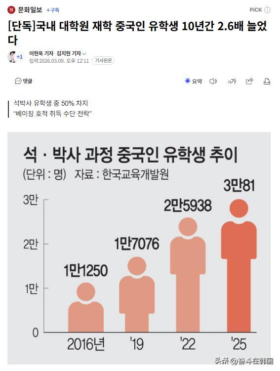 数据显示,近十年来,就读于韩国国内研究生院的中国留学生数量增长了约2.6倍。这一现象虽源于面临学费管制等困境的韩国大学积极吸引留学生的结果,但有人指出,部分中国留学生是为了获取北京户口而攻读韩国硕博学位,相关争议正在扩大。