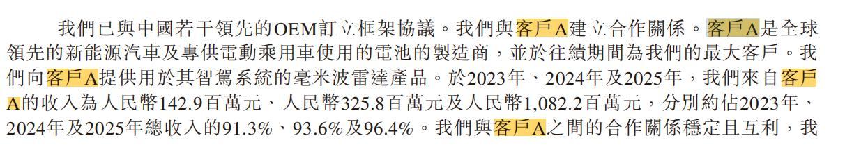 2023年至2025年,承泰科技来自比亚迪的收入分别为1.43亿元、3.26亿元及10.82亿元,分别占公司总收入的91.3%、93.6%及96.4%。