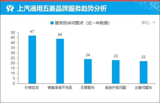 从服务投诉问题点来看,主要集中在“价格变动”和“销售承诺不兑现”方面。通过进一步分析可知,投诉问题来自五菱星光、五菱缤果以及宏光MINIEV等车型。