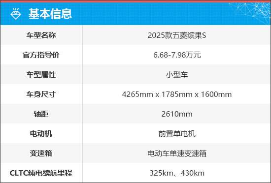售后服务政策方面,2025款上汽通用五菱缤果S整车质保四年或15万公里,首任车主三电终身质保/非营运(责任免除条款以官方为准)。