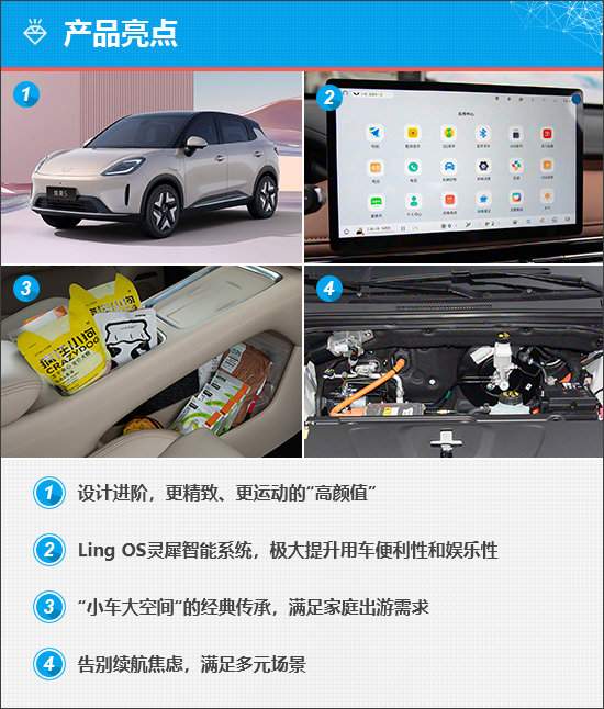 车机搭载Ling OS灵犀智能系统,智能语音交互支持可见即可说和连续对话功能。同时,新车还提供远程车控、在线导航/音乐等。对于这个价位的车型来说相当出色,极大地提升了用车便利性和娱乐性。