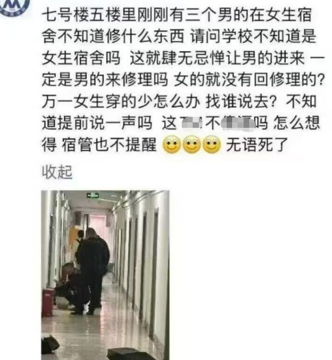 可话又说回来,虽然男工去女寝维修多有不便,但这也是无法避免的事情。毕竟维修工、保安队伍中,男性比例远超女性。再者说,维修工作是无法避免的,且频率也没有那么高,怎么说也不至于到了引起恐慌的地步吧。