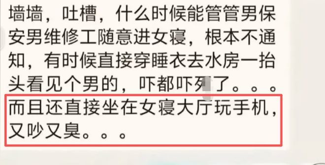 更让她无法接受的是,有时候还能看到一些男工在女寝的大厅里坐着玩手机,又吵又臭。不少同学看完这篇帖子,都心情复杂。一些女同学的确可以理解,在女寝看到男工时,猝不及防地都会被吓一跳。