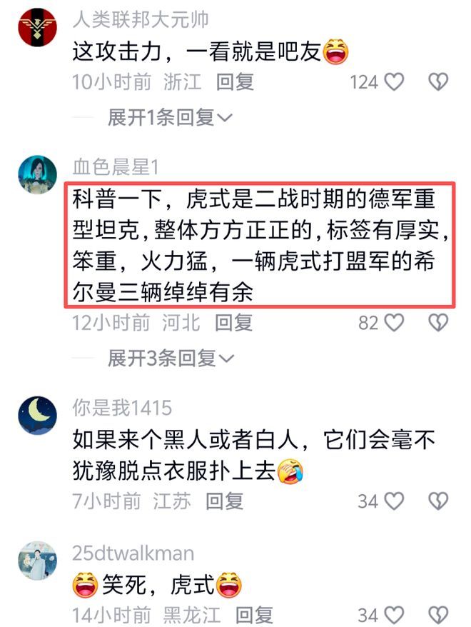 有趣的是,很多女生根本不知道“虎式”身材是什么意思,评论区有男同学科普:虎式是一种重型坦克的型号,整体方方正正,标签有厚实、笨重、火力猛等特点。这波回击含金量太高了,伤人于无形。