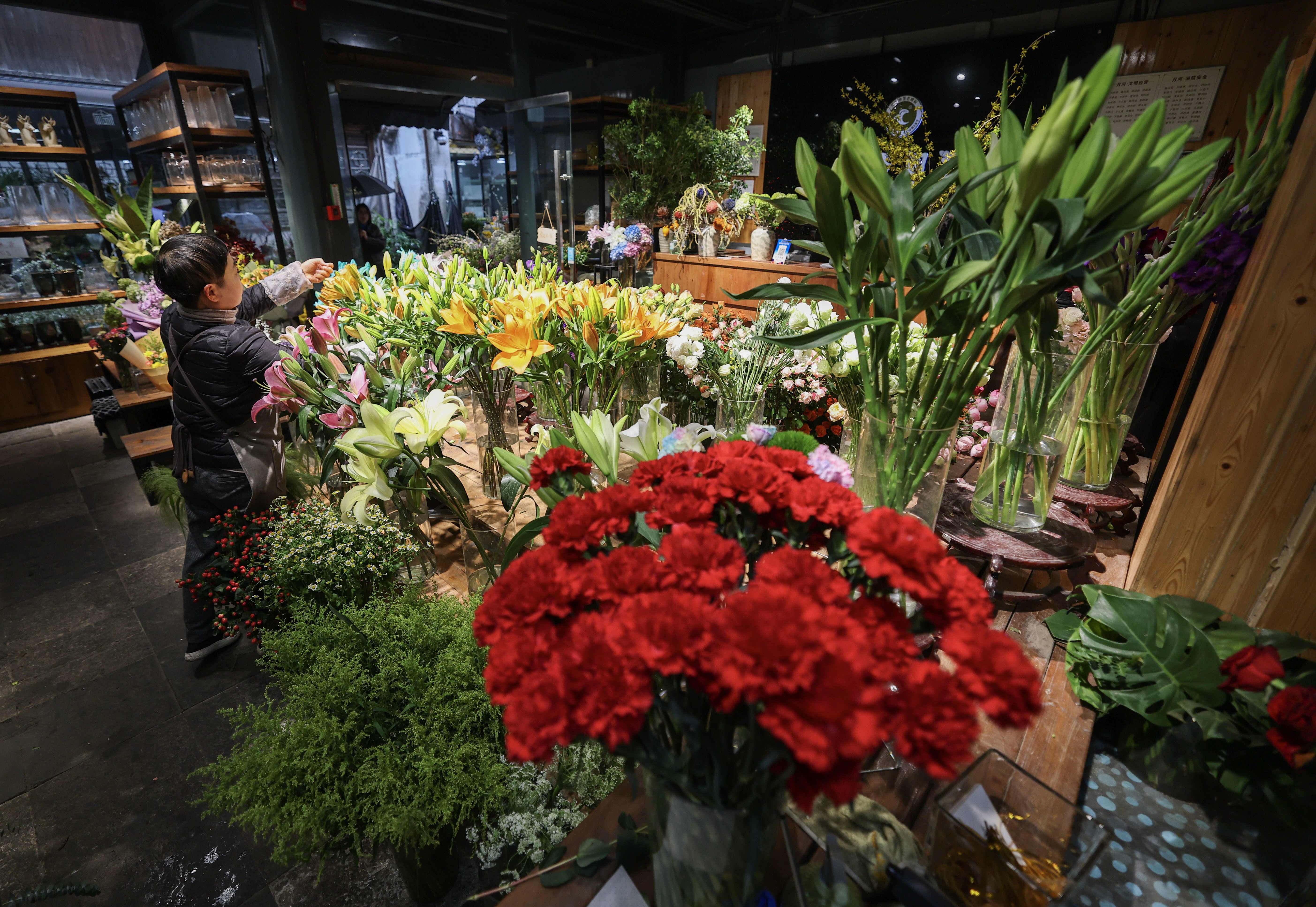 3月24日,月河历史文化街区的花店工作人员在整理花束。新华社记者 徐昱 摄